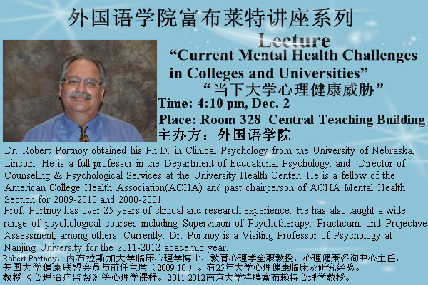 12月2日(本周五)下午4:10,在中心教學樓328室,外國語學院邀請到美國內布拉斯加大學臨床心理學博士、教育心理學系教授、心理健康咨詢中心主任Robert Portnoy來我校做“當下大學生心理健康威脅”的主題講座;