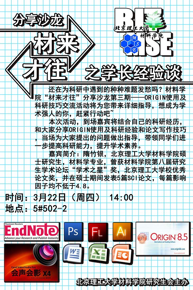 還在為科研中遇到的種種難題發愁嗎?材料學院“材來才往”分享沙龍第三期——origin使用及科研技巧交流活動將為您帶來詳細指導,想成為學術強人的你,趕緊行動吧~