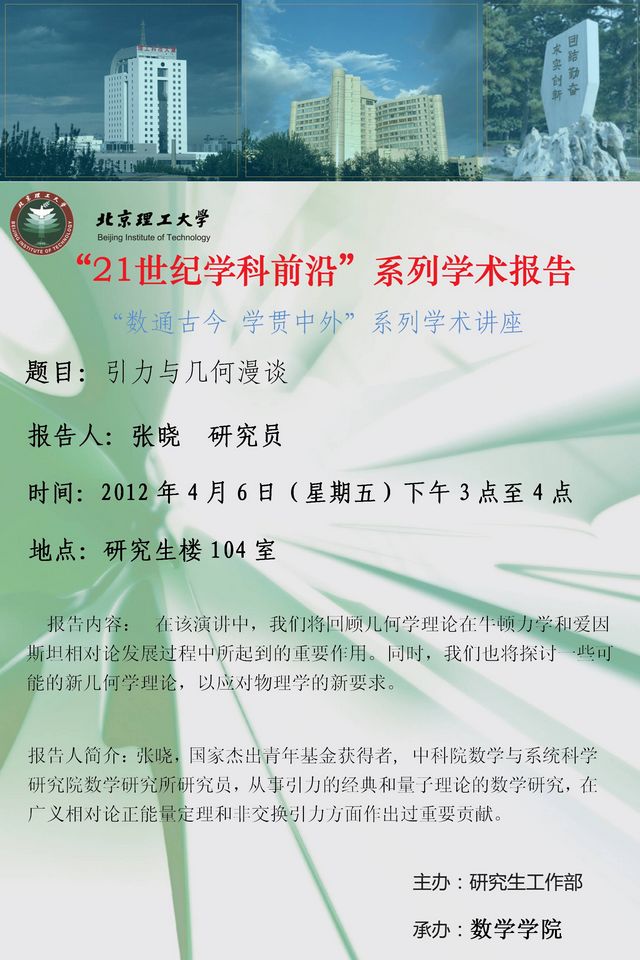 個人簡介:張曉,國家杰出青年基金獲得者, 中科院數(shù)學(xué)與系統(tǒng)科學(xué)研究院數(shù)學(xué)研究所研究員,從事引力的經(jīng)典和量子理論的數(shù)學(xué)研究,在廣義相對論正能量定理和非交換引力方面作 出過重要貢獻。