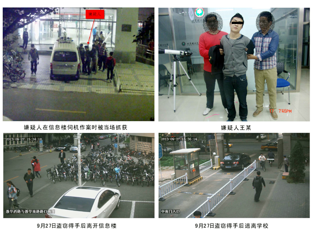 嫌疑人:王某、男、25歲、外地來京無業(yè)人員,由于王某被抓獲時(shí)并未實(shí)施盜竊,因此其矢口否認(rèn)曾經(jīng)在我校盜竊過財(cái)物。但是,當(dāng)保衛(wèi)處工作人員向其出示其作案時(shí)的視頻資料時(shí),該嫌疑人終于對其于9月27日在信息樓6002室盜竊一臺“華碩”筆記本電腦、10月5日在信息樓3002室盜竊ipad平板電腦的事實(shí)供認(rèn)不諱。保衛(wèi)處已將該犯罪嫌疑人和相關(guān)視頻證據(jù)材料移交公安機(jī)關(guān),目前,王某已被公安機(jī)關(guān)刑事拘留。