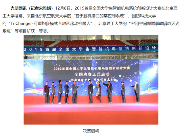 12月8日,2019首屆全國大學(xué)生智能機(jī)電系統(tǒng)創(chuàng)新設(shè)計(jì)大賽在北京理工大學(xué)落幕。來自北京航空航天大學(xué)的“基于腦機(jī)接口的某控制系統(tǒng)”、國防科技大學(xué)的“TriChanger-可重構(gòu)多模式全地形移動(dòng)機(jī)器人”、北京理工大學(xué)的“密閉空間爆燃事故瞬態(tài)滅火系統(tǒng)”等項(xiàng)目斬獲一等獎(jiǎng)。