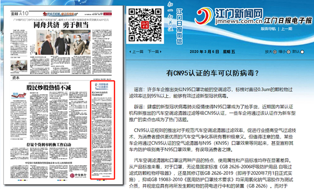 辟謠:肆虐的新型冠狀病毒肺炎疫情使得N95口罩成為了搶手貨,近期國內(nèi)某認證機構新推出的汽車空調(diào)濾清器過濾等級CN95認證,一些車企將通過該認證作為新車型推廣的賣點也成為了熱門話題。