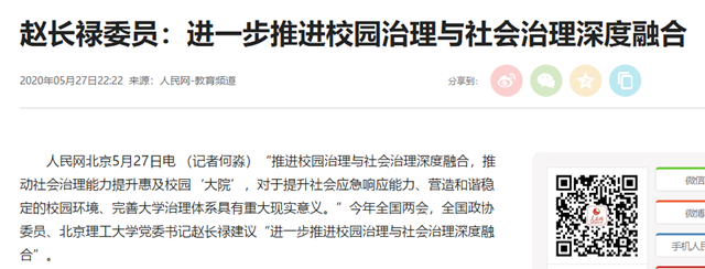 “推進校園治理與社會治理深度融合,推動社會治理能力提升惠及校園‘大院’,對于提升社會應急響應能力、營造和諧穩定的校園環境、完善大學治理體系具有重大現實意義?!苯衲耆珖鴥蓵?,全國政協委員、北京理工大學黨委書記趙長祿建議“進一步推進校園治理與社會治理深度融合”。