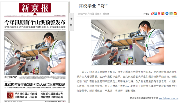昨日,北京理工大學(xué)良鄉(xiāng)校區(qū),師生志愿者在為男生打包行李,并通過視頻確認(rèn)這張照片主人是否需要。2020年高校畢業(yè)季,在北京就讀的大學(xué)生們因?yàn)橐咔椴荒芊敌#麄冞€“躺”在宿舍里的物品陸續(xù)走上郵寄返鄉(xiāng)之路。負(fù)責(zé)打包的主要是學(xué)校老師,小到針頭線腦,大到錢包首飾,為了不遺落一件物品,老師們開啟視頻連線的方式現(xiàn)場為學(xué)生們收拾行李。