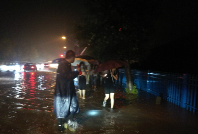 西山實驗區服務管理人員在汛期時送學生安全離開