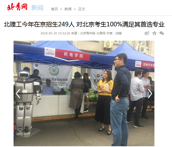 【編者按】5月20日,北京理工大學(xué)舉辦了校園開放日活動,2018年北理工在全國各省份普通本科一批招生時,實行“0調(diào)劑”政策,面向北京考生承諾100%滿足其首選專業(yè) 。不僅如此,2018年北理工繼續(xù)深入推行大類招生,擴大本科生入校后的專業(yè)選擇范圍。普通本科將采用10個大類專業(yè)名目進(jìn)行招生,入學(xué)第一年加強基礎(chǔ)和通識教育的同時,通過名師授課、專業(yè)引導(dǎo)和進(jìn)實驗室體驗等形式逐步增進(jìn)學(xué)生對不同專業(yè)方向的了解。此外,學(xué)校面向本科新生實施“書院制”管理。在書院中實施博雅教育,培養(yǎng)學(xué)生優(yōu)良品質(zhì);通過導(dǎo)師制,激發(fā)學(xué)生潛能和自我發(fā)展動力。《法制晚報》、北青網(wǎng)、中青在線、新浪網(wǎng)等各大媒體第一時間進(jìn)行了報道。