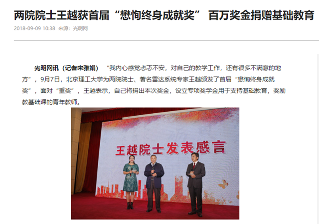 【中青在線】兩院院士王越獲北理工首屆“懋恂終身成就獎”