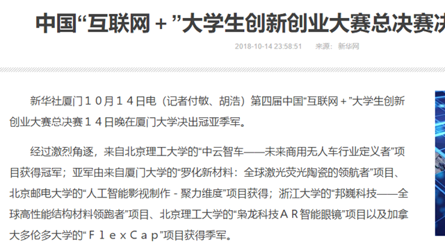 【新華網】中國“互聯網+”大學生創新創業大賽總決賽決出冠亞季軍