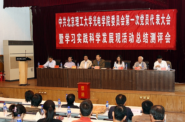 在光電學院第一次黨員代表大會上,光電學院總監票人董立泉首先宣讀了投票規則,在監票人現場監督下投票活動有序進行。光電學院副院長郝群宣布了《中共北京理工大學光電學院委員會(籌)關于表彰先進黨支部和優秀共產黨員的決定》,趙長明副院長宣布了《北京理工大學光電學院關于表彰“三育人”先進集體、先進個人和師德標兵、師德先進個人的決定》光電學院院長魏平做了光電學院學習實踐科學發展觀暨上半年工作總結報告。魏平主要從“三個階段、六個環節”總結回顧了光電學院上半年的工作情況,著重強調了院風建設,對科研工作的進步表示肯定,并對下半年的工作重點做了簡要部署。