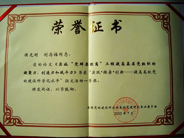 近日,全國黨建研究會高校黨建研究專業委員會2010年年會在內蒙古自治區滿洲里市召開。會上,宣布了“實踐•探索•創新---提高高校黨的建設科學化水平”征文活動獲獎名單。我校黨委副書記侯光明等撰寫的《實施“黨群零距離”工程,提高基層黨組織的凝聚力、創造力和戰斗力》在119篇參評論文中脫穎而出,被評為一等獎(共有10篇一等獎論文);另一篇論文《在改革中完善,在創新中發展》被評為優秀獎。