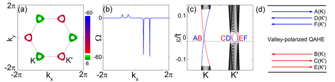 圖2 (a) 硅烯中谷極化的量子反常霍爾效應的Berry 曲率倒空間二維分布。(b) 該Berry 曲率分布沿ky=0的高對稱線的分布。(c) 硅烯zigzag納米帶的能帶結構。黑色的代表體態,彩色的表示邊界態,其中紅色和藍色表示相反的邊界。(d) 谷極化的量子反常霍爾效應示意圖。