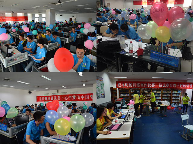 比賽從上午9點30分開始,比賽用時5個小時;共設置12道題目,采用ACM評分規則,程序正誤由Online Judge系統自動判評。長達5個小時的激烈角逐,不僅是腦力的比拼,而且是耐力的較量。參賽選手分工明確、協調統一,充分發揮自身優勢,以團隊的優勢攻堅克難。正是由于選手們的出色表現,比賽現場升起一個又一個彩球。