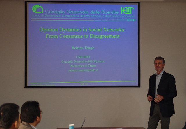Roberto Tempo教授從社會網絡的實際背景出發,給出了一種基于信息交互的社會網絡模型,用于模擬多個個體就某一話題進行交流,最終得到各自看法的過程。同時,針對多個有關聯話題的交流問題,Roberto Tempo教授給出了自己最新的研究進展,并從理論上證明了相關模型的可行性。會后,Roberto Tempo教授與本校師生進行了熱烈的交流與討論。