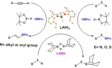 楊智副教授課題組在其最近研究成果(Angew. Chem. Int. Ed. 2015, 54, 10225,Hot Paper)的基礎上,設計并合成了新的鋁二氫化合物。其催化炔、醇、胺、以及硫醇的硼氫化反應獲得了很高的催化產(chǎn)率。相關成果最近發(fā)表在J. Am. Chem. Soc. 2016, 138, 2548(美國化學會會志,化學領域頂級期刊,IF=12.1)上。
