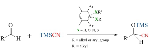 該課題組最近合成了含Al-O-C、Al-O-S以及Al-O-N結構片段的新型有機鋁化合物,成功將其用于高效催化羰基與TMSCN的加成反應中,并系統(tǒng)的研究了各催化劑所含不同取代基團對催化效果的影響。相關成果最近在著名化學期刊Chemistry-An European Journal(歐洲化學,DOI:10.1002/chem.201505162)上在線出版。