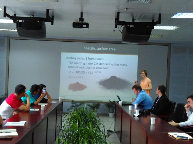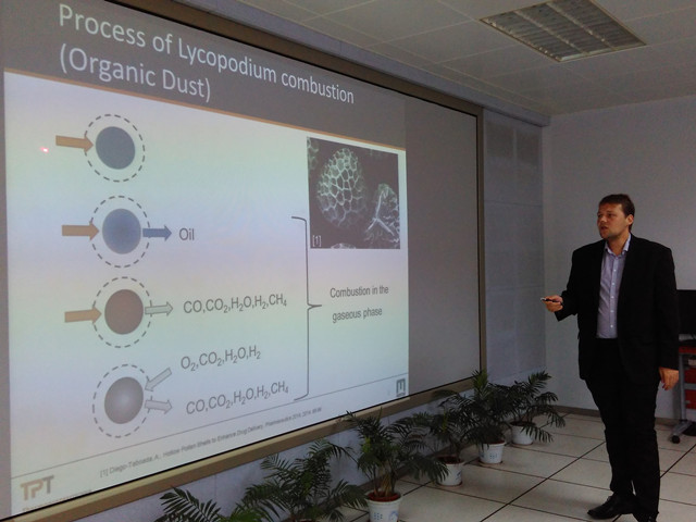 Kern Hannes 教授首先介紹了他所領導的團隊近年來所取得的研究成果,并對工業爆炸安全和應急救援等發展趨勢和科學前沿進行了詳細的闡述。3位博士分別從計算建模、數值模擬和實驗測試等方面分別介紹了不同尺度的粉塵顆粒的擴散、燃燒、爆炸等現象,分析了粉塵爆炸的壓力、溫度隨時間的演變規律。他們的學術研究具有前沿性,研究成果在奧地利的煤礦和化工企業中得到了很好的應用。報告內容詳盡且精彩,贏得了參會師生的強烈興趣,并進行了熱烈的討論。