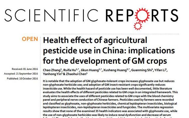 Chao Zhang, Ruifa Hu, Jikun Huang, Xusheng Huang, Guanming Shi, Yifan Li, Yanhong Yin & Zhaohui Chen. Health effect of agricultural pesticide use in China: implications for the development of GM crops. Scientific Reports . 2016, 6: 34918.