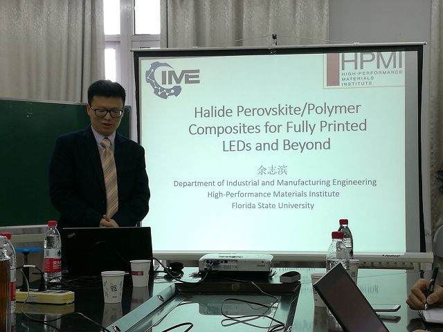 2016年12月29日,佛羅里達州立大學工業工程和制造系余志濱博士應邀到北理工材料學院做學術報告,于上午10:00在4號教學樓502會議室面向全院師生做了題為“Halide Perovskite/Polymer Composites for Fully Printed Light-Emitting Diodes and Beyond” 的學術報告。該報告會系北理工材料學院“21世紀學科前沿” 系列學術交流活動之一。會議由材料學院鐘海政教授主持,材料學院30余學生(包括本科生、碩士和博士研究生)聆聽了精彩報告。