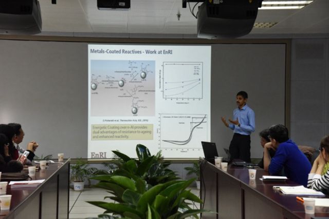 報告中,Hng Huey Hoon教授介紹了新加坡南洋理工大學含能材料研究所的基本情況、研究方向以及未來的發展規劃,并明確提出希望能與實驗室進行長期的學術交流與全面合作。Sreekumar Pisharath博士從含能材料的分子設計、制備與感度性能等多方面介紹了團隊的工作成果,其中對于含鋁炸藥的包覆結構、納米化CL-20炸藥、高能粘合劑GAP的分子結構改進、高氮化合物的合成等進行了詳細的闡述;Seng Yeow Sing博士從化學反應機理模型、爆炸物燃燒性能的預測、沖擊作用過程中的熱動力學模型等方面進行了講解。報告內容引起了在場師生的強烈興趣,并進行了深入的交流與討論。