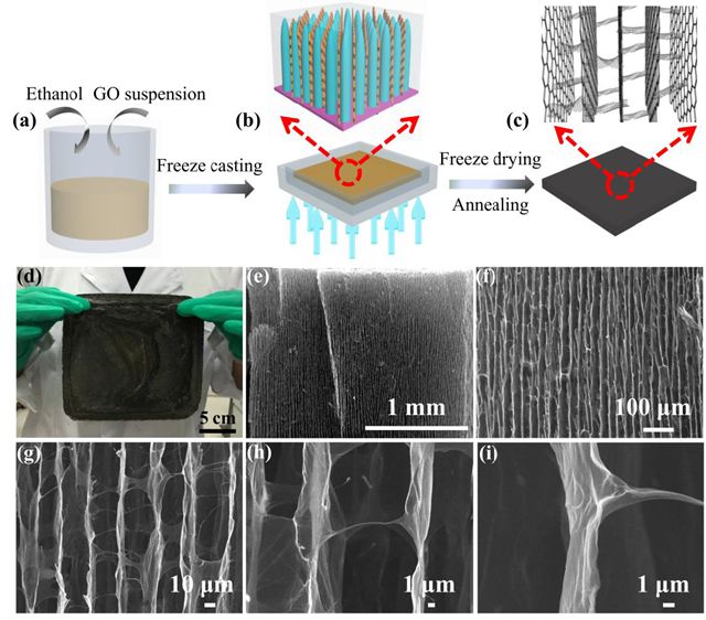 VA-GSM制備過程大致如圖1a-c:在7 mg·mL-1的GO溶液中混入少量乙醇(GO:ethanol = 30:1)形成混合溶液,再將溶液倒入一定尺寸的PTFE模具中,將該模具放入液氮中進行單軸定向冷凍,利用冰晶生長形成長程有序的垂直排列結構,將該結構進行干燥、煅燒,最終便得到VA-GSM,其SEM見圖1d-i。另外,該種方法得到的樣品宏觀尺寸大小可以根據模具的尺寸進行相應的調整。