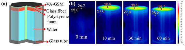 另外,文章也驗證了VA-GSM大片層的力學性質,發現該材料可用進行隨意彎曲、剪切以及在較大壓力下進行壓縮測試。文章解釋道,這可能與垂直排列的結構中,夾雜著rGO的片層結構起到一定的支撐作用有關。在應用方面,文中組裝成了如下裝置進行水蒸發實驗(如圖2)。