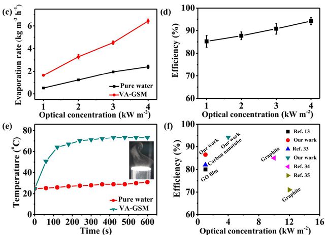 經過測試,該膜分別在一個光源和四個光源的情況下,水的蒸發率能達到1.62 kg· m-2·h-1和6.25 kg·m-2·h-1,其太陽能轉換率分別可達到86.5%和94.2%,這比以往報道過的大多數碳材料的太陽能轉化率都要高。而這種用途對于緩解水資源危機起到了很好的作用,它可以將不同來源的水(海水、廢水以及濃酸、濃堿溶液)高效快速地轉化為凈水。在之前相關方面的研究中,采用的材料為3D陽極氧化鋁膜、聚吡咯沉積不銹鋼網、基于金納米顆粒薄膜的無塵紙等,它們不能在有機、強腐蝕性酸和強堿等惡劣環境中使用,因此不能實現產業的規模化。而文中得到的VA-GSM材料具有高孔隙率、高吸光率,而且在惡劣環境中也能夠穩定存在(能承受3000 oC的高溫以及-196 oC的低溫),優勢十分明顯。