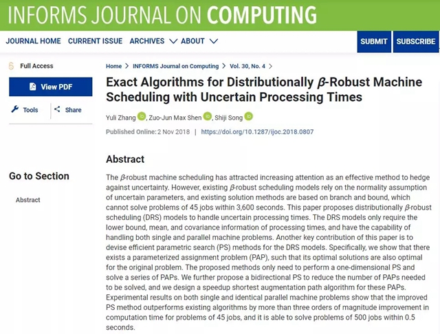 北理工管理與經濟學院教師張玉利與美國加州大學伯克利分校申作軍教授、清華大學宋士吉教授合作的研究成果“Exact Algorithms for Distributionally β-Robust Machine Scheduling with Uncertain Processing Times”在運籌與管理領域頂級期刊《INFORMS Journal on Computing》發表。張玉利特別研究員為本文第一作者。該刊為美國運籌學和管理學研究協會(INFORMS)季刊,是國際商學院研究能力評估參考的24本頂級期刊(UT-Dallas 24期刊)之一。
