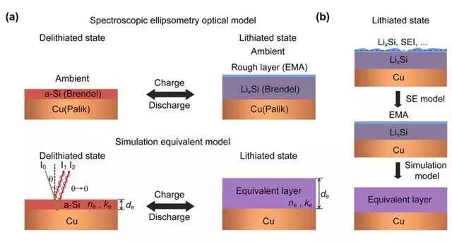 該團隊通過實驗和理論模擬進一步研究了該仿生變色器件中的電化學力學耦合變色機理。采用橢偏儀測試了其不同鋰化程度下的納米硅薄膜的光學常數(折射率和消光系數),以及相對應的納米硅薄膜的厚度,驗證了鋰化納米硅薄膜的化學演化過程。通過建立光學理論模型,預測出不同嵌鋰程度下的器件反射率,其預測結果和實驗測試吻合,進一步驗證了該仿生變色器件的調控機理。