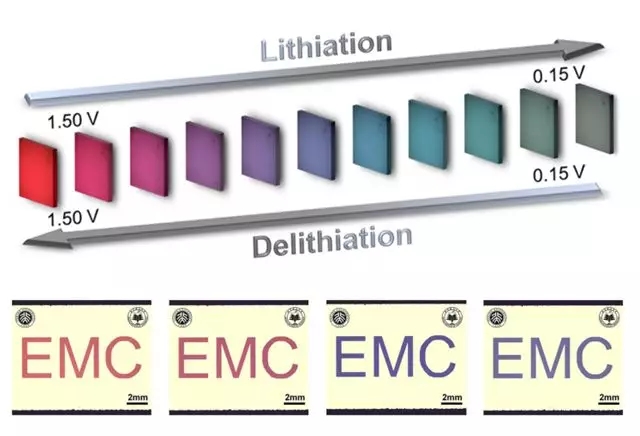 該仿生結構變色器件具有很強的設計應用前景,改變硅薄膜的初始厚度和導電集流體顏色,可以任意定制所需要的顏色調控范圍。通過光刻技術,可以定制各種顯色圖案。并且,該變色系統和硅基鋰離子電池具有良好的兼容性,在硅基鋰離子電池的可視化實時監控中也有巨大的應用前景。