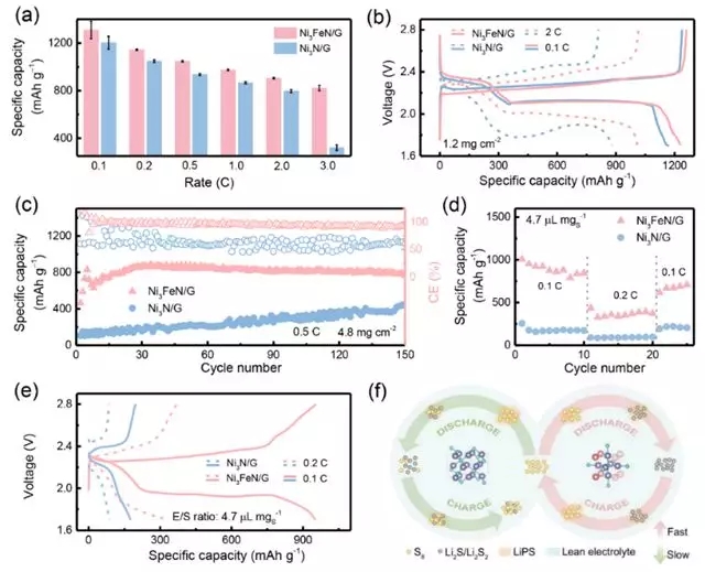鐵元素通過多硫化物的原位刻蝕作用而浸出,產生高活性的富空位相,從而促進了多硫化物的動力學轉化過程。這種富空位的Ni?FeN催化的Li–S電池表現出優異的倍率性能和高硫負載下的循環穩定性,并且可以極大降低電解液用量。這項工作不僅闡述了惰性單金屬化合物的外在金屬活化機制,也證明了原位相演化和空位的形成在調節催化反應中的重要作用。