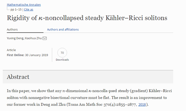 日前,北京理工大學(xué)數(shù)學(xué)與統(tǒng)計(jì)學(xué)院鄧宇星副研究員在國際頂級學(xué)術(shù)期刊《Mathematische Annalen》在線發(fā)表題為“Rigidity of k-noncollpased steady Kaehler-Ricci solitons”的研究論文。該論文研究了具有非負(fù)雙全純截面曲率的體積非塌穩(wěn)態(tài)型縮凱勒-里奇孤立子(steady Kaehler-Ricci solitons)的剛性,證明了具有非負(fù)雙全純截面曲率的體積非塌縮凱勒-里奇孤立子必然是平凡的。作為該定理的應(yīng)用,論文還證明了長時(shí)間存在的凱勒-里奇流必然是體積極大增長的度量所生成的凱勒-里奇流。