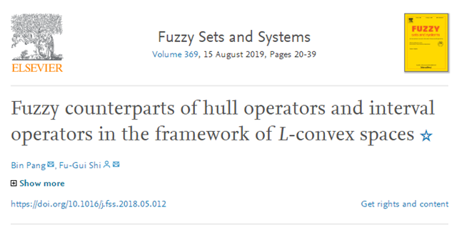 2019年,龐斌副研究員和史福貴教授在完備格的格值環(huán)境下引入了L-凸包算子的概念,在完備剩余格的格值環(huán)境下定義了L-序凸包算子,在完全分配格的格值環(huán)境下給了L-區(qū)間算子的定義,并充分利用取值格上的邏輯結(jié)構(gòu),系統(tǒng)建立了它們與L-凸結(jié)構(gòu)的范疇關(guān)系。相關(guān)論文“Fuzzy counterparts of hull operators and interval operators in the framework of L-convex spaces”發(fā)表在頂級期刊《Fuzzy Sets and Systems》。此項工作成功給出了研究L-凸結(jié)構(gòu)理論的兩個最為基本的工具,即L-凸包算子和L-區(qū)間算子,為L-凸結(jié)構(gòu)理論的深入研究奠定了理論基礎(chǔ)。此論文一經(jīng)發(fā)表便得到了國內(nèi)外學(xué)者的廣泛關(guān)注,并入選ESI高被引論文。