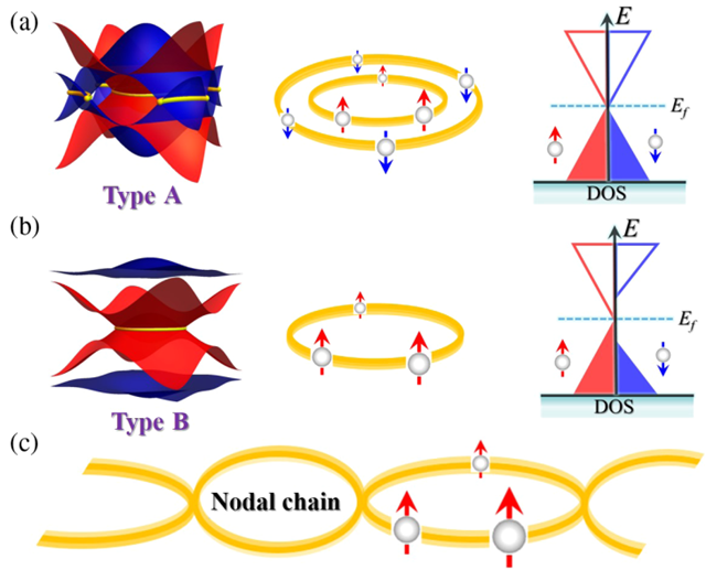 圖1 自旋零帶隙節(jié)線半金屬的不同類型及相應(yīng)的態(tài)密度。紅色代表自旋向上的通道,藍(lán)色代表自旋向下的通道。黃色代表節(jié)線態(tài)。