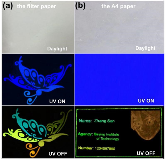 此外,作者又探索了摻雜材料在防偽打印方面的應用。作者首先的把主體化合物附著在商業性A4紙以及不具有熒光發射的普通紙上,再把客體分子溶解在實驗室常用溶劑如二氯甲烷中以用作油墨。在紙張上可以進行手寫繪畫或者進行噴墨打印,由于商業性A4紙具有很強的熒光背景,因此在日光燈和紫外光照射下均不能得到相應的信息,只有在去除紫外光照射后的幾秒內呈現動態的顏色變化。所以該油墨打印出的證件具有極大的防竊取性。