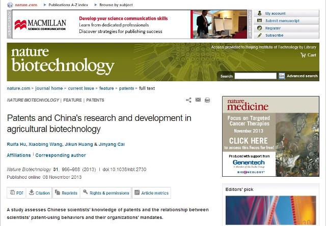 日前,北京理工大學管理與經濟學院胡瑞法教授、蔡金陽博士與中科院農業政策研究中心黃季焜教授、王曉兵副教授合作撰寫的論文《Patents and China's research and development in agricultural biotechnology(專利和中國農業轉基因生物技術研究)》被國際著名學術期刊《Nature》子刊《Nature Biotechnology》接收并發表。這是作者繼去年在Nature Biotechnology上連續發表了兩篇論文之后,第三次在該刊發表論文。