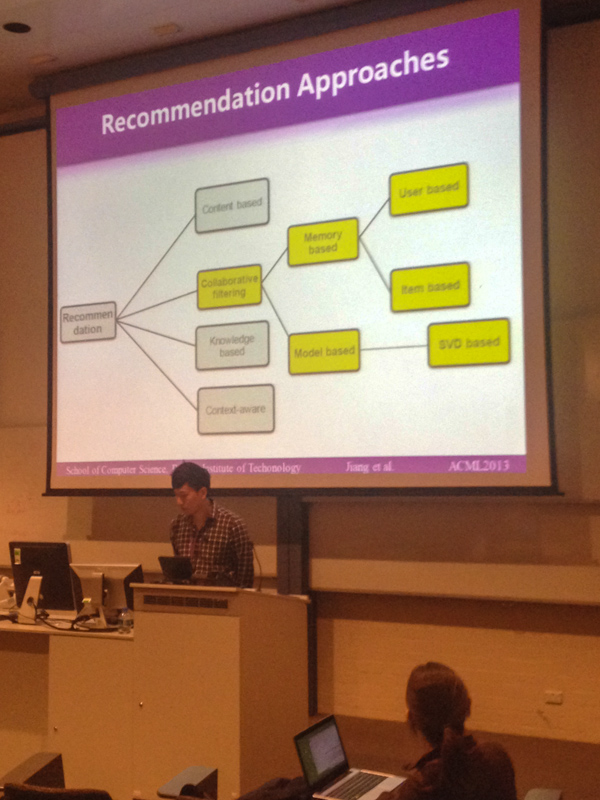ACML全稱為Asian Conference on Machine Learning,是機器學習領域的主流國際學術會議之一。本次會議是第五屆會議,于2013年11月13日-15日在澳大利亞首都堪培拉召開,承辦單位為澳大利亞國立大學。大會共收到來自22個國家包括東京大學、加州大學歐文分校、澳洲國立大學、魯汶大學、臺灣大學等學校在內的102份投稿,共接收論文32篇,其中長文錄取13篇,短文錄取19篇,共有兩篇論文獲得獎勵。