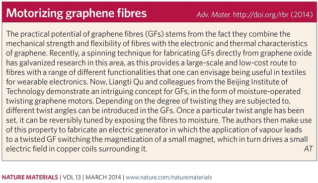在上述研究的基礎上,該課題組博士研究生程虎虎同學進一步對石墨烯纖維進行了巧妙的旋轉預加工,使其表面具有了一定的緊密螺旋結構,制造出一種在外界濕度變化情況下可以沿自身軸向高速旋轉的纖維,最高轉速可達5190轉每分鐘。他們將這種新型功能纖維不僅用于濕度響應的開關,并且成功開發為一個小型的濕氣發電機,該發電機可以通過周圍環境濕度的變化來產生電能。當該成果在線發表于國際重要材料期刊《Advance Materials》上,國際頂級材料刊物《Nature Materials》立即將北京理工大學的這項研究結果作為Research Highlights進行了報道。
