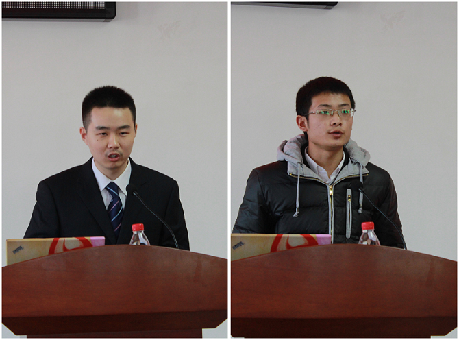 隨后,來自2011級實驗班的彭開南同學代表“優異生獎學金”獲得者發言。彭開南同學首先代表所有獲獎學生向學院和老師表示感謝,并表示設立學院獎學金是對同學們學習工作的肯定和鼓勵。彭開南同學在發言中說道,“這是我們最好的時代”,號召大家要開啟自己的未來,早計劃,早安排,不要輕視自己的能力、浪費自己的天賦,為自己、為北理、為我們可愛的祖國努力。接著,2012級信息科技菁英班班長胡文慶同學作為“學習成績優秀班集體”獲獎代表,向大家報告了班級中各班委各司其職,同學團結向上,最終取得優異成績的情況,與廣大同學交流了建設優秀班集體的經驗和體會。