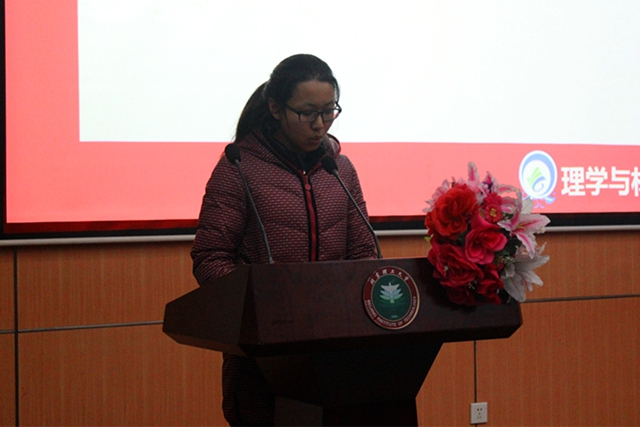 2014級生物工程專業(yè)第一——羅惠同學(xué)作為獲獎學(xué)生代表上臺發(fā)言。她從合理規(guī)劃時間、重視課堂學(xué)習(xí)以及參加專業(yè)相關(guān)科技創(chuàng)新活動三方面向大家分享了大一的收獲,并倡議大家要做一個勤奮的大學(xué)生,找到自己的目標(biāo),并努力為之奮斗。