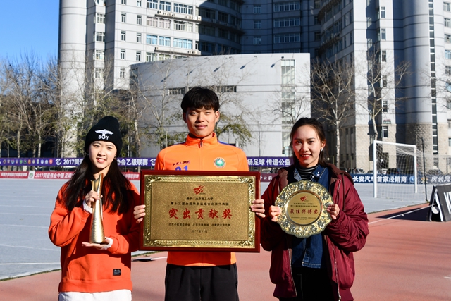 11月29日,中華人民共和國第十三屆學(xué)生運動會北京代表團(tuán)表彰大會在清華大學(xué)舉行。北京市教委、北京市體育局、共青團(tuán)北京市委和北京市大學(xué)生體育協(xié)會相關(guān)領(lǐng)導(dǎo)出席。在表彰會上,北京市代表團(tuán)授予我校 “突出貢獻(xiàn)獎”,授予我校足球隊 “最佳拼搏獎”。