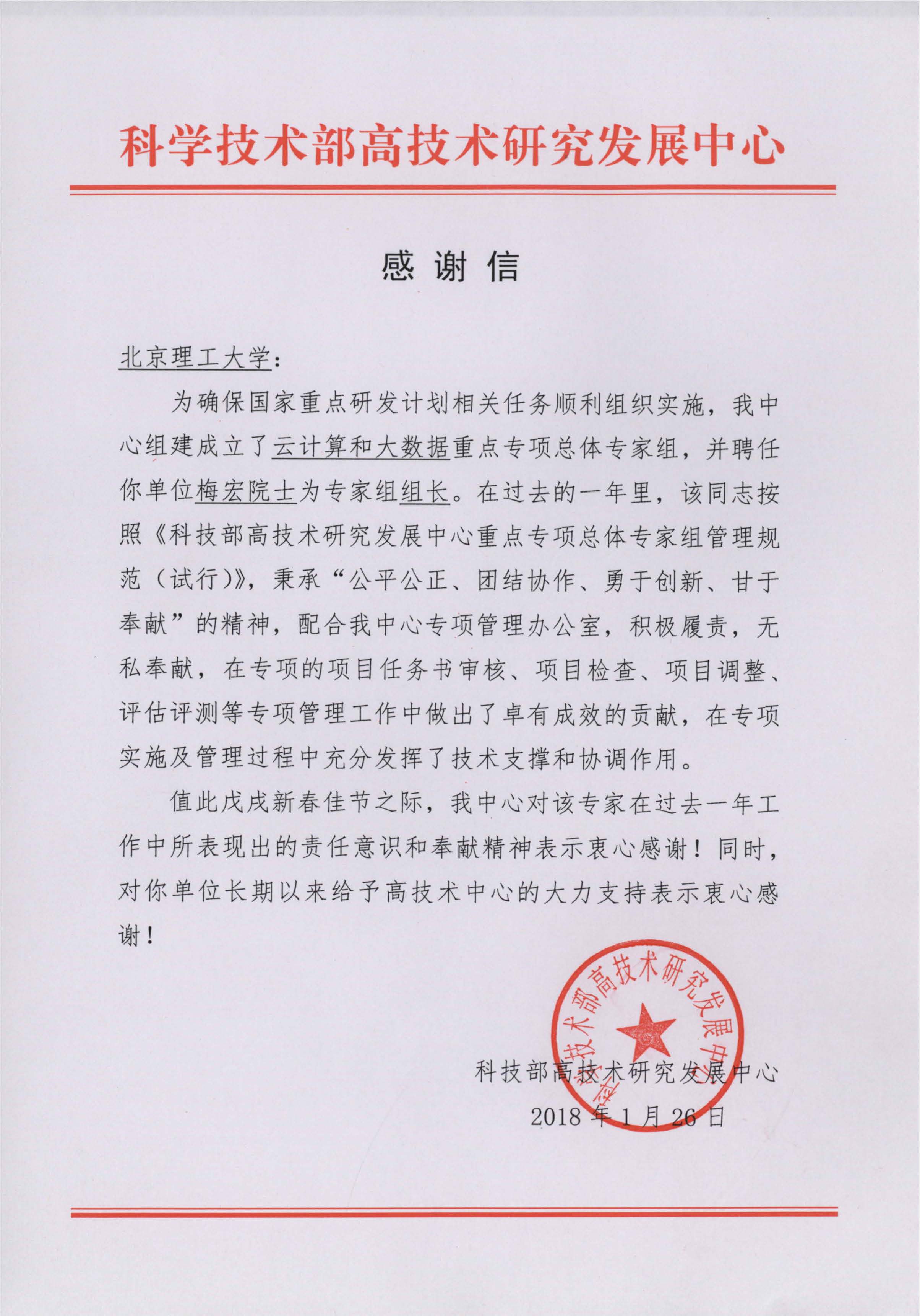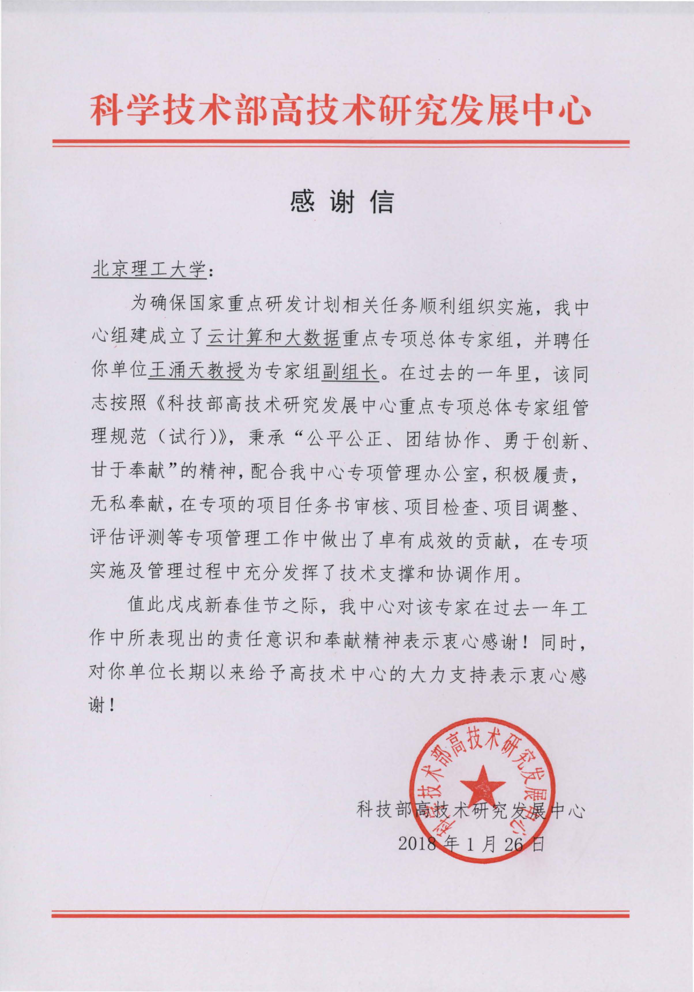 日前,北京理工大學收到科學技術部高技術研究發展中心發來的感謝信,感謝我校梅宏院士、王涌天教授作為云計算和大數據重點專項總體專家組組長、副組長在重點專項管理工作中給予的大力支持。