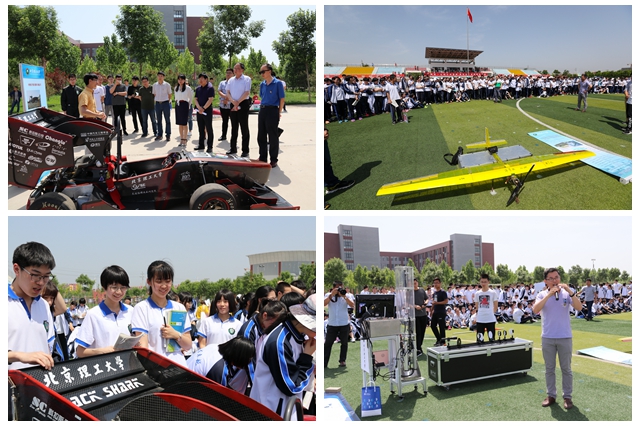 隨后,面向高中和初中年級1000余名衡中學子代表的“大學生科技作品”展示在高中部和初中部的操場舉行,近距離展現了北京理工大學在大學生科技創新、綜合素質培養方面的突出成就。航模隊載重空投、空對地偵察、無動力定點降落、教練機等屢獲大獎的飛機進行了靜態展示;TEMS團隊對該“挑戰杯”一等獎作品的光學、機械、控制、圖像采集與處理各系統的奧秘進行了現場解說;賽車隊方程式賽車、節能競技車、巴哈越野車進行了動態展示,風馳電掣、速度激情,帶來了精彩絕倫的極速盛宴。
