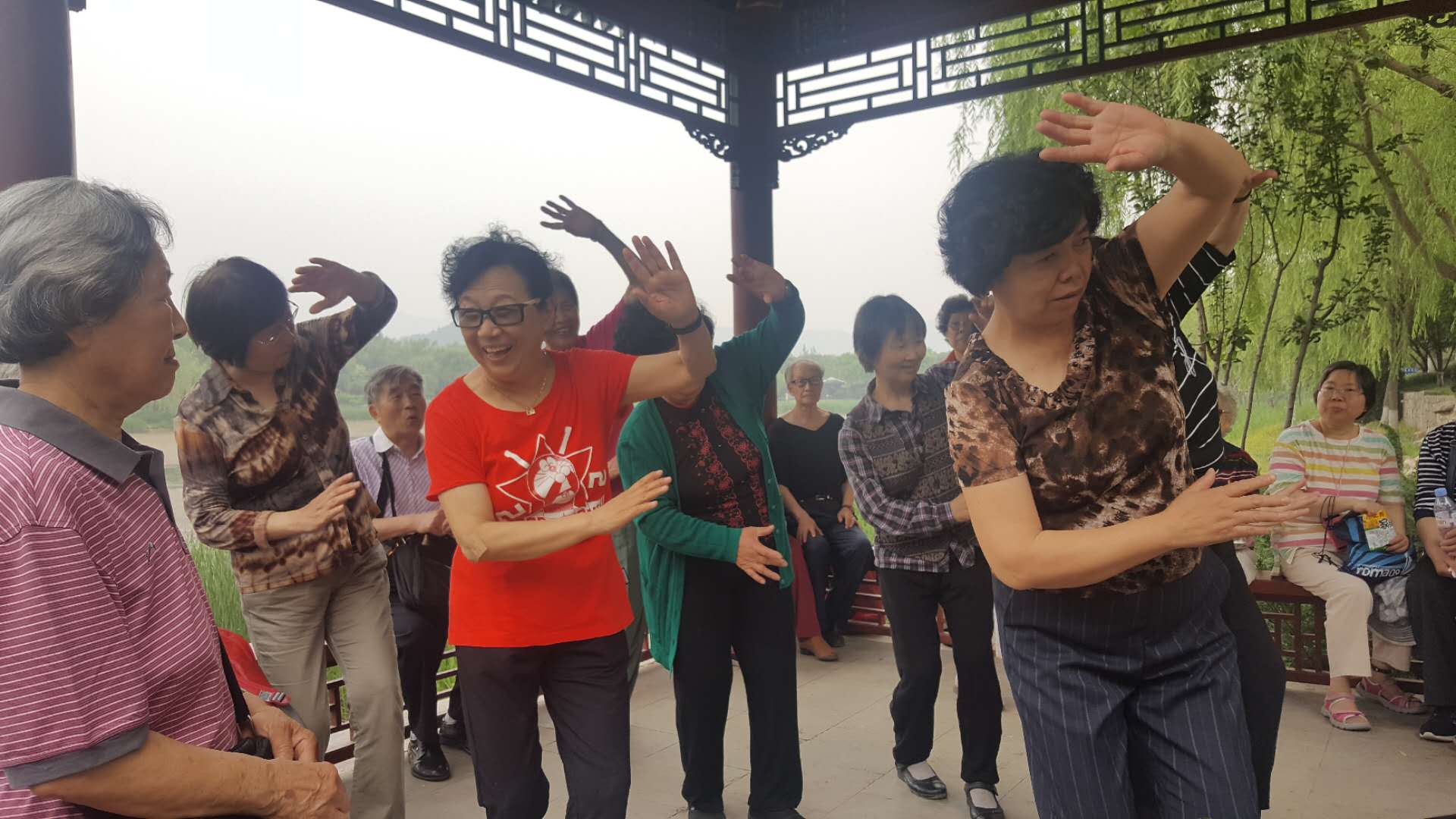 沿湖泊北岸而行,一行人來到蜿蜒曲折、依水而建的曲廊,坐下休息,正對一片翠綠的松林,松濤澎湃別有一番風韻。面對如此美景,大家興之所至擊掌而歌,詠歌之不足,又手之舞之足之蹈之,充分展現北理工離退休教職工良好的精神面貌和積極向上的陽光心態。
