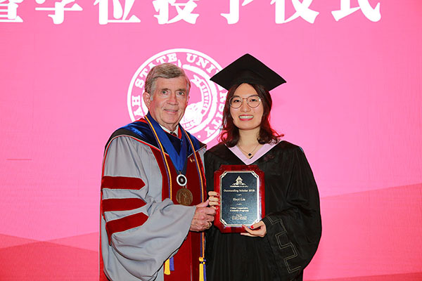 梅文博對前來參加典禮的嘉賓及師生表示熱烈歡迎,并宣布典禮開始。國際教育學院副院長蔣志湘宣讀了獲得猶他州立大學經濟學理學學士學位的102名畢業生名單。Robert Wagner和Janis Boettinger為全體畢業生頒發了猶他州立大學學士學位證書并一一合影留念。Dwight Israelsen代表猶他州立大學亨茨曼商學院授予劉賀一同學2018年度杰出畢業生稱號,并頒發杰出畢業生獎牌。