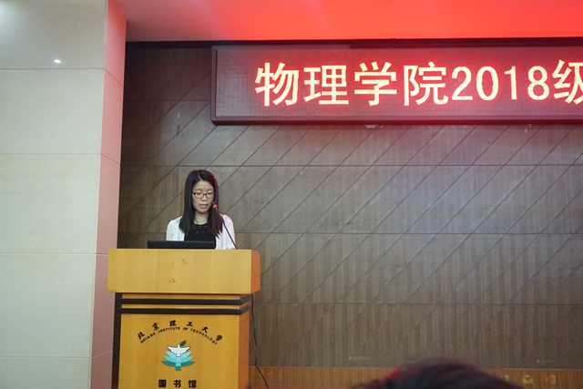 姜艷代表學院向開啟新的學習階段的2018級研究生表示祝賀和歡迎。她介紹了學校及學院的歷史沿革,講述北京理工大學如何成為中國共產黨創辦的第一所理工科學府的背景;講述70多年來幾代北理工人不忘初心、艱苦奮斗,崇德尚行、潛心治學,為抗戰建國、為國家安全和經濟建設、為中華民族偉大復興而探索和開拓的感人故事;講述物理學科作為學校最早建立的基礎學科之一,從設立之初到如今物理學院的發展脈絡。她還對同學們提出三點希望:第一,希望同學們胸懷祖國,志存高遠;第二,希望同學們潛心學問,積極創新;第三,希望同學們求真務實,恪守學術道德。鼓勵同學們迎著物理學科建設的新機遇,銘記“寧拙毋巧,寧樸毋華”的院訓,與導師們一并努力奮斗、開拓前行,為學校的“雙一流”建設貢獻自己的力量。