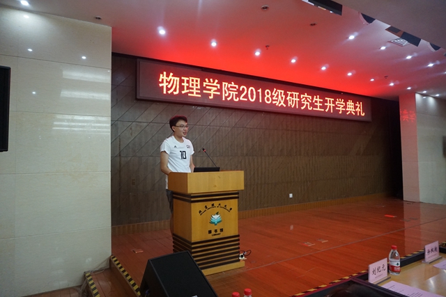 2018級研究生尹思瀚代表新生發言。尹思瀚同學表達了考入物理學院的激動心情,講到自己作為一名新北理人對“德以明理、學以精工”校訓的理解。對即將開始的研究生階段學習,表示將盡快從思想上完成從本科生到研究生身份的轉換,樹立高遠的人生志向,注重自主性、創新性的學習,牢記“團結、勤奮、求實、創新”的校風,在學術領域積極探索,刻苦鉆研,追求卓越。