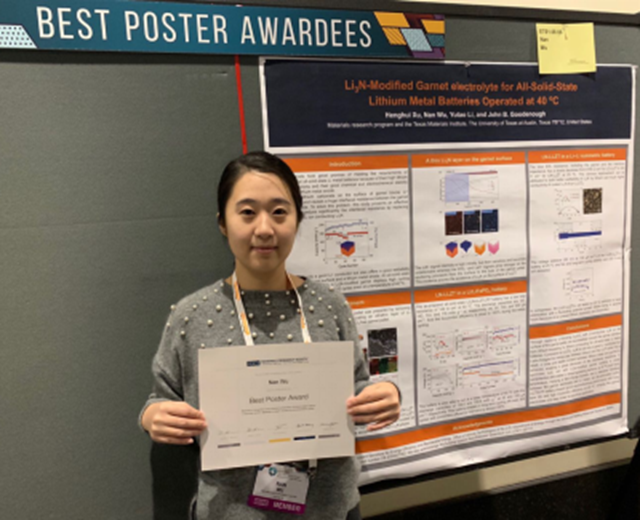材料學院博士生吳楠于2016年9月加入金海波教授課題組,主要從事堿金屬電池固態電解質的研究,目前在美國德克薩斯大學奧斯汀分校John B. Goodenough教授課題組進行聯合培養。吳楠同學報名參加此次大會,在固態電池分會作墻報展示,獲得“最佳墻報”獎勵。