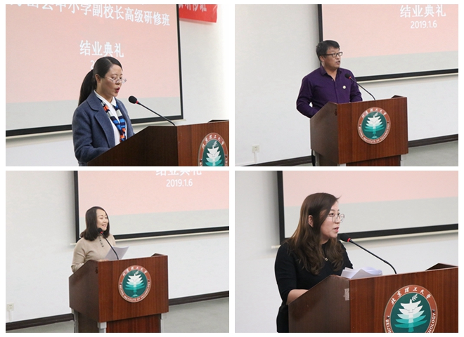 結(jié)業(yè)儀式上各參會領(lǐng)導(dǎo)為學(xué)員們頒發(fā)了結(jié)業(yè)證書;六位學(xué)員小組組長分別以《感悟中成長-扮演好自己的角色》《開發(fā)校本特色的德育活動 開展卓有成效的德育教育》《如何有效的開展家校合作》 、關(guān)于小學(xué)生心理健康教育的思考》《淺談小學(xué)班級管理》和《如何有效開展幼兒園區(qū)域活動》為題作了主題報告。