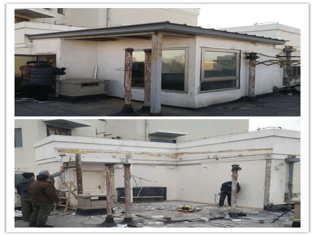 經過前期安全排查,12月20日上午校居委會、保衛部、物業管理與后勤服務公司、校醫院等部門工作人員齊聚家屬區134單元高層樓頂露臺,對居民在樓頂私搭的違建進行拆除。拆除現場分工明確,秩序良好。1小時后,占地約15平米,高度近2米,采用簡易鋁合金、彩鋼板和玻璃結構的違建“陽光房”拆除完畢。