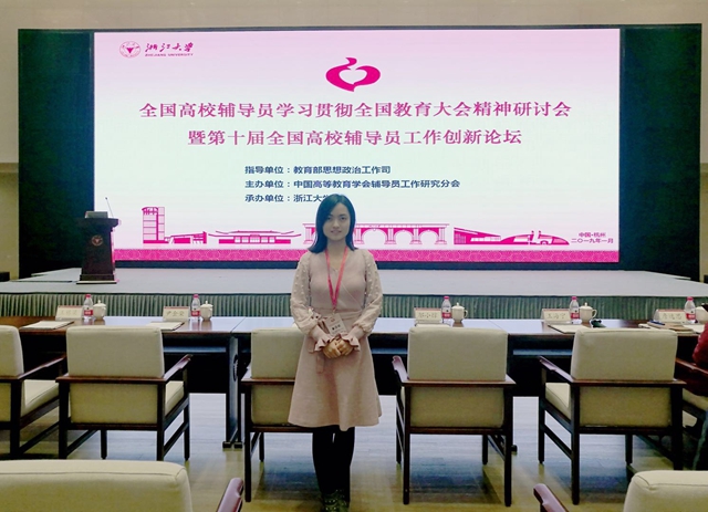 2019年1月4日至5日,全國高校輔導員學習貫徹全國教育大會精神研討會暨第十屆全國高校輔導員工作創新論壇在浙江大學舉辦,我校數學與統計學院輔導員楊青萌作為優秀輔導員代表受邀參會。